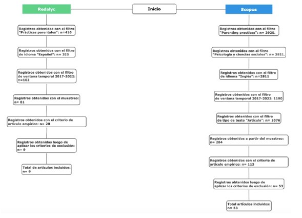 En primer lugar, se realizó una exploración en la base de datos Redalyc, con el siguiente protocolo de búsqueda: se introdujo la palabra clave prácticas parentales. Seguido de esto, se usó un filtro de ventana temporal de los años 2017 a 2022, con el fin de incluir la literatura de los últimos cinco años, por considerarla representativa y suficiente con respecto al objetivo del trabajo. Posteriormente, se usó el filtro de textos tipo artículo, en el idioma español. En segundo lugar, se realizó la búsqueda en la base de datos de Scopus introduciendo la palabra clave parenting practices y se limitaron los resultados a los textos tipo artículo, admitiendo las publicaciones en psicología y ciencias sociales, en el idioma inglés, en la misma ventana temporal del primer caso.