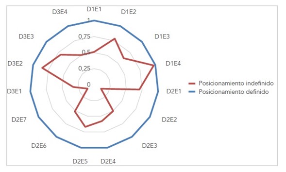 De tal manera, los presentes resultados indican que este espacio es una herramienta útil para avanzar en el objetivo de estudiar y caracterizar el posicionamiento parental. Tal como ilustra la figura 2, es posible anticipar y ejemplificar la forma en que se podrían configurar diversos posicionamientos (en su dimensión de posición2) en virtud del nivel de definición a favor o en contra de los valores particulares de cada eje incluido, observados en la práctica y el comportamiento de padres/madres potencialmente participantes. En ese sentido, la línea interior ilustra un posicionamiento parcialmente definido, en el cual el participante hipotético únicamente tendría una tendencia conductual definida en el eje 4 de la dimensión 1 (D1E4: estilo educativo), mientras que en los demás no habría tal nivel de definición o preferencia sistemática por algún valor específico. Por su parte, la línea exterior representa lo que sería un posicionamiento completamente definido, en el cual el participante hipotético tuviera una clara tendencia conductual que favoreciera siempre a algún valor de cada eje, por encima de su valor opuesto.