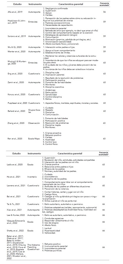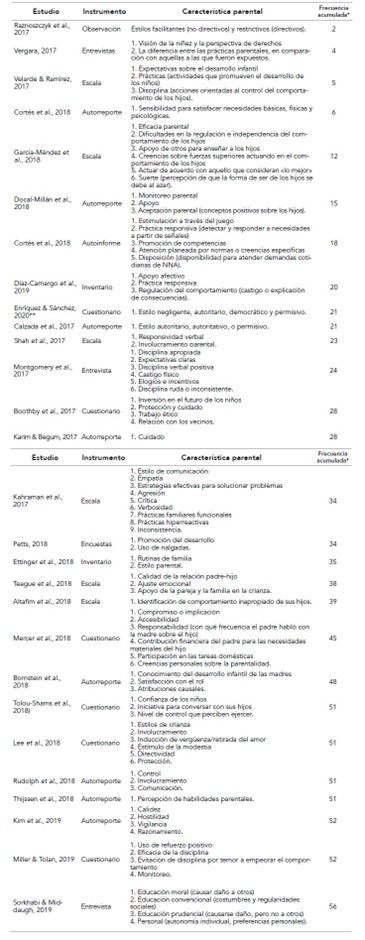 La tabla 1 ilustra los resultados directos de la revisión. Tal como se puede observar, se identificaron 66 características diferentes, a través de dos tipos generales de instrumentos: registro de observaciones e instrumentos de autoinforme o autorreporte (incluyen entrevistas, encuestas, escalas, cuestionarios e inventarios). Sin embargo, únicamente el 3% (dos estudios) utilizan estrategias de observación, lo cual evidentemente implica un notorio énfasis en el uso de instrumentos de autoinforme (97%); dentro de los cuales, a su vez, es evidente un uso predominante de instrumentos estandarizados (59%), sobre estrategias de entrevista y grupos focales, siendo reiterado el uso del Alabama Parenting Questionarie y la escala Maps.