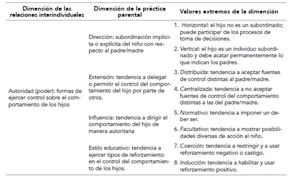 Sobre lo primero, según Ribes et al. (2016; Ribes, 2021), cualquier ámbito o relación social se compone de tres dimensiones: el poder, que consiste en administrar contingencias que permiten la dominación de grupos e individuos a través del establecimiento de jerarquías; la sanción, que consiste en limitar el comportamiento mediante juicios y justificaciones; y el intercambio, el cual se caracteriza por la complementación entre individuos (Ribes, 2018, 2021). En consecuencia, si consideramos que la expresión «práctica parental» describe un fenómeno social, también podemos identificar estas dimensiones en dicho contexto.
