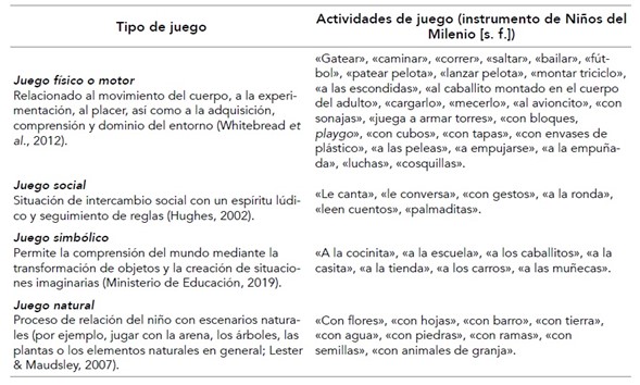 La información se recolectó mediante un formato abierto que permitió registros múltiples de las actividades de juego entre padres e hijos. Posteriormente, se clasificó de forma manual, para establecer las siguientes tipologías de juego: físico o motor, social, simbólico y natural. En la tabla 1 se presentan las categorías de juego agrupadas según las respuestas.