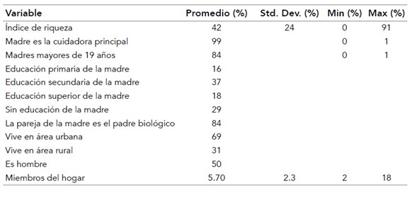 Para medir las relaciones de interés, se empleó un enfoque de regresión lineal multivariada. Los resultados de los distintos modelos lineales multivariados se controlan por características del niño (edad R1, género), características del hogar (área de residencia, tamaño del hogar, índice de riqueza), características del cuidador principal (madre es la cuidadora principal, madre es mayor de 19 años y educación de la madre) y características de la comunidad (clúster de residencia). Así mismo, el modelo incorpora efectos fijos de comunidad y los errores estándar se agrupan en clúster de comunidad (tabla 2). La tasa de pérdida muestral entre el 2002 y el 2016 corresponde al 8.1 %, siendo baja en comparación con estudios longitudinales comparables en países en desarrollo (Sánchez & Escobal, 2020).