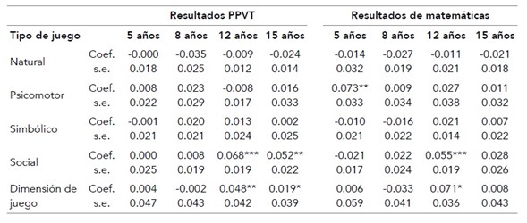 Nota. ***, ** y * denotan significancia estadística (s. e.) al 1 %, al 5 % y al 10 %, respectivamente. La dimensión de juego es un índice construido y estandarizado con base en el total de juegos realizados (juegos naturales, psicomotores, simbólicos y sociales).