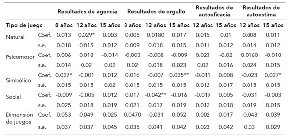 Así mismo, se evidencia una asociación positiva entre el juego natural con el índice de agencia a los 12 años (2.9% de una desviación estándar). Por otro lado, el juego simbólico se relaciona significativamente con el índice de agencia a los 8 años (2.7% de una desviación estándar), con orgullo a los 15 años (3.5% de una desviación estándar) y con l autoestima generalizada a los 15 años (2.7% de una desviación estándar). En cuanto al juego social, se observa una relación negativa significativa en el índice de orgullo a los 12 años (4.2% de una desviación estándar).