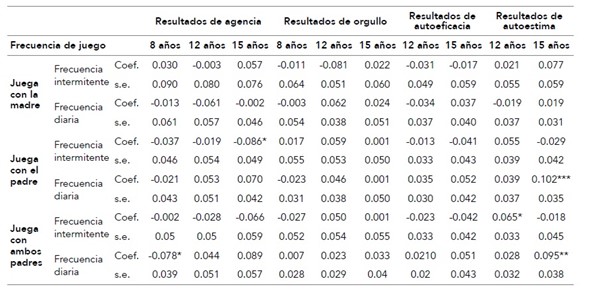 Se hallaron resultados de relación significativa entre el juego diario con el padre y la autoestima a los 15 años (10.2% de una desviación estándar) y una relación negativa significativa entre el juego intermitente con el padre y el índice de agencia a los 15 años (8.6% de una desviación estándar). En la frecuencia de juego con la madre no se encontraron relaciones de significancia para competencias socioemocionales. Finalmente, en el juego con ambos padres, se identificó una relación significativa para la autoestima cuando el juego es intermitente a los 12 años (6.5% de una desviación estándar), así como una relación significativa con la autoestima a los 15 años cuando la frecuencia de juego es diaria (9.5% de una desviación estándar). Por otro lado, se encuentra una relación negativa significativa en la agencia a los 8 años (7.8% de una desviación estándar).