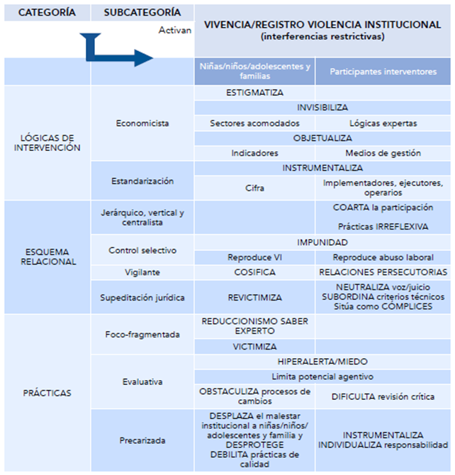 La violencia institucional aquí revisada se expresa a través de programas o procedimientos (Martínez & Sánchez, como son citados en Salamanca, 2018). Opera a partir de un entramado complejo (La Parra & Tortosa, 2003; Vitale et al., 2015) que se aloja en el campo de la gestión-intervención del sistema de protección y está conformada por las categorías descritas, así como por las vivencias o registros de violencia y los efectos que estas implican: exclusión, restricción de la agencia, objetualización, victimización, debilitamiento, entre otros. La violencia institucional presenta una expresión visible, como señalan los informes sobre violencia en centros residenciales, pero también otra invisible, que se desprende de las operaciones ritualizadas, rutinizadas, no intencionales (Ginga & Campana, 2018) e indirectas (Ávila et al., 2020) que se dan a partir de este complejo entramado de racionalidades, relaciones, prácticas, vivencias y efectos. Por tanto, la violencia institucional puede ser entendida como una cadena de violencias que se narra como un continuo en el que los miembros de los equipos profesionales de la red de protección se vuelven testigos de la violencia institucional (victimizaciones o revictimizaciones) hacia niñas, niños y adolescentes y, a la vez, sujetos de esta; y donde las niñeces, juventudes y sus familias se encuentran en el último eslabón.
