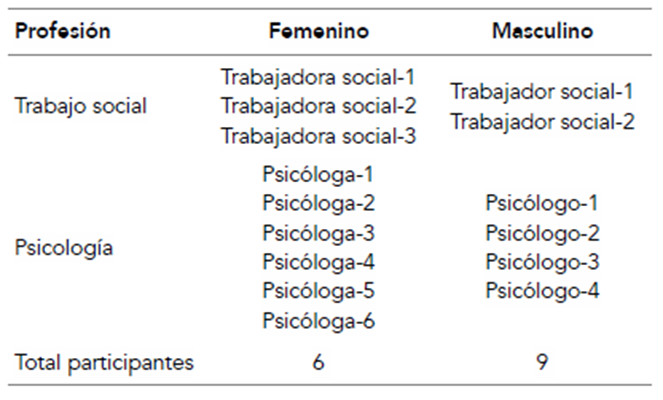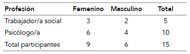 Tras la utilización de la técnica de bola de nieve, se contactó a un participante, luego a otro y así sucesivamente. De esta forma se convocó a quince profesionales: diez del área de psicología y cinco de trabajo social de diferentes programas ambulatorios de las siguientes comunas de la Región Metropolitana: Lo Espejo, La Pintana, Santiago, Recoleta, San Miguel, Pedro Aguirre Cerda, Renca y Cerro Navia ( Tabla 1 ).