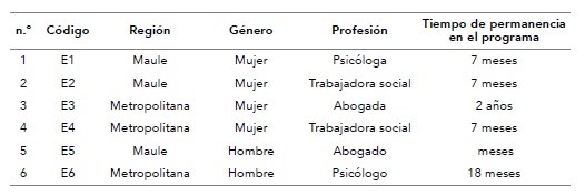 Se realizó un muestreo teórico (Glasser & Strauss, 1967), ya que las y los participantes fueron seleccionados según su rol y riqueza de la información para los propósitos de esta investigación. Las y los participantes fueron seis profesionales activos del PMA de la Región Metropolitana y del Maule, dependiente de la Corporación de Asistencia Judicial, quienes tenían una experiencia mínima de seis meses en su cargo, considerando la reciente implementación del PMA (tabla 1).