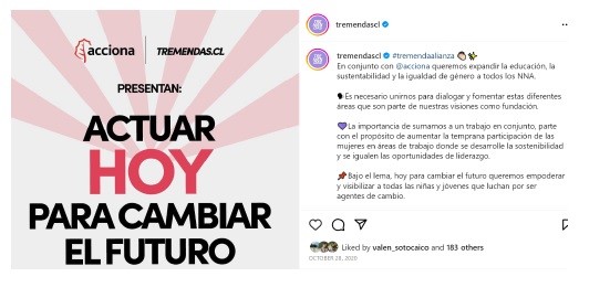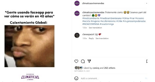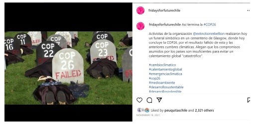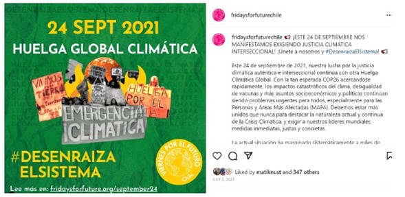 Nota. Tomada de © Fridaysforfuturechile. [Instagram] (14 de noviembre de 2021). © Fridaysforfuturechile. Reproducida bajo el amparo de la ley colombiana en tanto que su uso corresponde a una investigación científica, es un uso honrado (de un bien no comercializable) y su difusión en la revista no tiene ánimo de lucro.