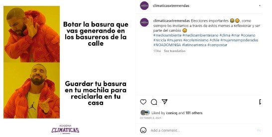 En el caso de su iniciativa ClimaticasxTremendas, realizó la primera entrada de la Academia Climáticas expresando con claridad su intención de sensibilizar con la temática ambiental como alternativa diferenciadora de generaciones anteriores para poder tener futuro. Las publicaciones informativas de este perfil se caracterizan por ofrecer datos, argumentos o ideas sustentadas científicamente y con un matiz pedagógico, explicando de forma sencilla las problemáticas sobre las cuales quieren discutir y ofreciendo recomendaciones. Una diferencia con respecto a las otras dos organizaciones es que ocupan con frecuencia el recurso de la risa y la ironía mediante memes para dar cuenta de las consecuencias del cambio climático (figuras 10a y 10b), al estilo de lo que señala Figueroa- Grenett (2018) sobre la posibilidad de apertura a lo imaginario que genera la articulación de elementos lúdicos y festivos en el accionar político juvenil.