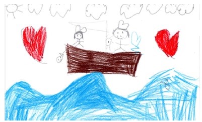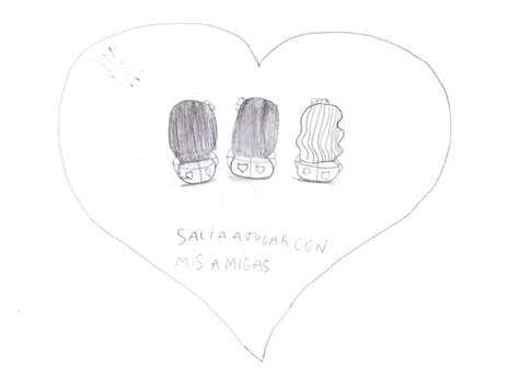 En los casos donde el tema central se categorizó como relación afectiva con otros, se identificó que las emociones predominantes fueron alegría y diversión. En dos de estos dibujos dichas emociones se graficaron a través de la interacción positiva entre personas significativas: en un caso se representa la relación de una hija con sus padres (principalmente con la madre), quienes disfrutan de un día de pesca; mientras que, en el otro, se retrata el vínculo de amistad de una niña con sus amigas, quienes aparecen dibujadas dentro de un corazón (figura 6). Adicionalmente, en estos dibujos las emociones alegría y diversión son confirmadas por lo expresado en los relatos de sus autoras, quienes hacen mención, respectivamente, a la felicidad de realizar una actividad de esparcimiento en medio de un espacio natural (el mar) y en compañía de los padres, así como a la importancia de poder salir a jugar con las amigas durante la pandemia.