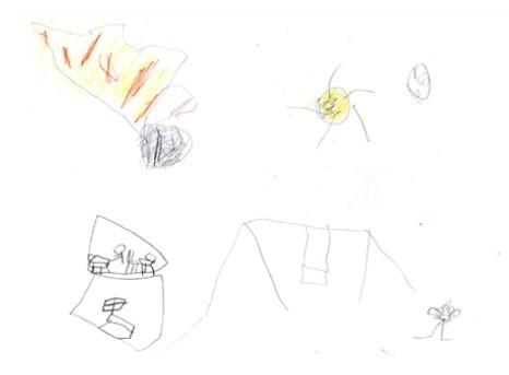 Respecto a la relación entre amenaza del entorno y miedo, fue posible reconocer que todos los dibujos donde se vinculan ambas subcategorías fueron realizados por niños. En estos casos se identificó que las amenazas que generaban miedo provenían del exterior. Si bien hubo dibujos donde no se aludía directamente al virus, en ellos igualmente se hizo referencia a amenazas poco reconocidas y, por lo tanto, difíciles de abordar. Lo anterior se pudo observar tanto en el dibujo del meteorito, como en el que se describe un suceso paranormal: en el primer caso, lo que genera miedo es la llegada del meteorito y la posible destrucción de todo lo existente; en el segundo, el miedo se asocia a una constante incertidumbre que no tiene un origen claro.
