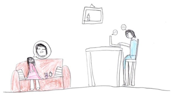 Respecto al aburrimiento, este se pudo identificar en tres dibujos que hacían alusión al confinamiento y a la presencia de otras personas en la casa, con quienes los/as niños/as no se encontraban en interacción. En uno de estos dibujos la participante hace especial énfasis en este último punto, destacando en la gráfica y en el relato que se encontraba aburrida, mientras su madre «teletrabajaba», con una sonrisa en su rostro (figura 9).