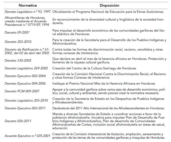 En Honduras se han establecido tres políticas públicas orientadoras y estratégicas para combatir el racismo y la discriminación racial, reconociendo y valorando la contribución de los pueblos afrodescendientes al país. Actualmente se cuenta con la política pública etnoracial para el desarrollo integral de los pueblos indígenas y afrohondureños; así mismo, el Decreto Ejecutivo n.º PCM-027-2016, y el Decreto Legislativo n.º 330-2002 que modifica al Decreto n.º 70-96 del 30 de mayo de 1996, en el cual se declara el 12 de abril como el Día de la Etnia Negra Hondureña.