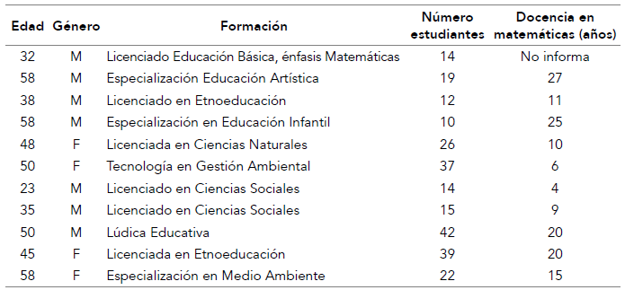 Los docentes ( tabla 1) son en su mayoría hombres (63%), edad media de 45 años, 91 % con formación universitaria, 36% con formación posgradual. Del último título obtenido, dos reportan Licenciaturas en Etnoeducación y uno Licenciatura en Educación Básica con Énfasis en Matemáticas. Su experiencia en docencia en el área de matemáticas va desde los 4 a los 27 años. Todos reportaron saber qué es etnomatemática o haber tenido alguna formación en ella.