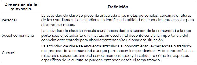 Para la recolección de los datos se utilizó la encuesta y la videograbación. La encuesta, de respuesta abierta, fue dirigida a profesores y estudiantes explorando cuatro dimensiones: relevancia personal, relevancia social-comunitaria, relevancia cultural y percepción de utilidad de las matemáticas (tabla 3). En total se hicieron tres preguntas por cada categoría.
