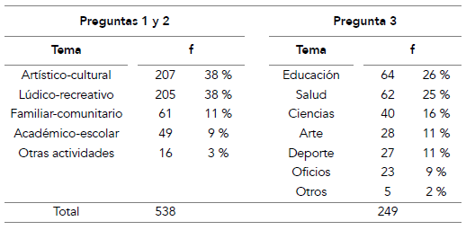 En la dimensión personal de la relevancia se rastrearon los intereses, actividades y roles futuros de los niños. En la tabla 5 se observa que, respecto a los intereses y actividades (preguntas 1 y 2), los niños reportan especialmente actividades artísticas y culturales (38%; dibujar, leer, danzar, cantar, escuchar música, tocar instrumentos musicales, tejer o cocinar) y actividades lúdico-deportivas que implican diversión, esfuerzo o trabajo en equipo (38%; fútbol, rayuela, parqués, nadar, ponchado, carros, voleibol, videojuegos, entre otros). Un menor porcentaje de las respuestas se asocia a las actividades familiarescomunitarias (11%; conversar con los amigos, familiares o ayudar en las tareas de casa) o las actividades académicas-escolares (9%; hacer tareas y estudiar). Respecto a los roles futuros (pregunta 3), aparecen profesiones asociadas a la educación (26%), en particular, ser docentes; así como también las profesiones asociadas al área de la salud (doctor, enfermera, veterinario, psicóloga; 25%). En tercer lugar (16%), se destaca la categoría «ciencias» que incluye diferentes ramas de ingeniería (industrial, forestal, agrónoma). Los «oficios» de agricultor, policía, bombero, vigilante o conductor tienen una representación del 9% en las respuestas.