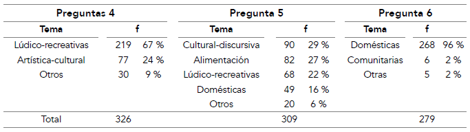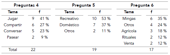 La tabla 6 indica que la interacción de los estudiantes con sus pares (pregunta 4) se inscribe preferentemente en actividades lúdicas y recreativas (67%). Además del juego en sus diferentes versiones (fútbol, la lleva, rayuela, ir al río, entre otros), las actividades culturales y artísticas (24%), como cantar, tejer, bailar y, especialmente, las que tienen que ver con prácticas discursivas (contar cuentos, conversar, compartir experiencias entre otras) son las que más despiertan gusto entre los estudiantes al compartir con amigos. Estas prácticas discursivas son las que más reportan disfrute en los niños cuando se les pregunta por los espacios que comparten con sus familias (29%, pregunta 5) como, por ejemplo, «Escuchar cuentos de mi abuela», «Hablar de paseos» «Reír de los chistes de mis padres». En segundo lugar, los espacios que más disfrutan con la familia refieren al proceso y consumo de alimentos (27%; comer, almorzar, ayudar a cocinar). El juego también es un espacio de disfrute con las familias (22%). Finalmente, los niños reportan ayudar a sus familias (pregunta 6), fundamentalmente en trabajos domésticos (96%) relacionados a cocinar, hacer oficios, coger café, en la huerta, alimentar a las gallinas, sembrar, trabajar en el tul, etc. Solo cuatro niños reportan participar en mingas como actividad comunitaria (2%).