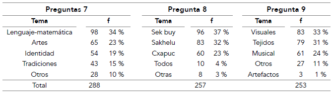 Respecto a su cultura e identidad (tabla 7), los estudiantes reportaron un mayor interés por su propia lengua (nasayuwe) y sus artes (pregunta 7). Entre las artes de interés (pregunta 9) destacan las de tipo visual (dibujar y pintar murales), los tejidos (sombreros, manillas, bolsas, mochilas, chumbes, jigras) y musicales (cantar, danzar, tocar $auta, tocar tambor). Entre las tradiciones que más interesan a los niños (pregunta 8), se encuentra el Sek buy (ritual del sol), el Sakhelu (ritual a la madre tierra) y el Cxapuc (ritual de la ofrenda).