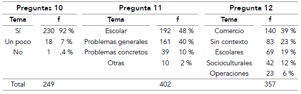 Para los niños, las matemáticas sirven para dos contextos principalmente (pregunta 11, tabla 8): para realizar operaciones básicas de tipo escolar (48%) como sumar, contar dividir, multiplicar y restar, y para la vida cotidiana (40%) como, «Para hacer cuentas» «Para aplicar en el trabajo», «Para aplicar en la vida cotidiana», entre otros. Solo en un 10% de los casos los estudiantes señalan actividades concretas, como, por ejemplo: «Para tejer mejor», «Para manejar plata», «Para hacer compras», «Para medir casas», «Las mingas comunitarias para aprender a contar». Por otro lado, cuando se pregunta dónde los estudiantes utilizan de forma cotidiana las matemáticas (pregunta 12), la mayoría (39%) señala las prácticas comerciales asociadas a la «Compra de mercado», «La tienda escolar», «En la tienda de mi mamá», entre otros. Una cuarta parte (23%) señalan acciones sin contexto («En el trabajo») y un 19% señala utilizarlas para actividades escolares tales como «Las tareas que pone el profesor». Un 12 % reporta usos diarios en aspectos de la cultura como las artesanías, la huerta o en la fabricación de instrumentos propios. El 92% de los estudiantes indican que les gusta la clase de matemática (pregunta 10).
