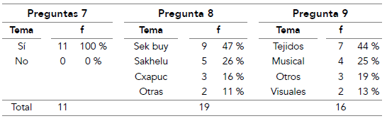 Respecto a la cultura e identidad de los niños (tabla 11), todos los profesores perciben que sus estudiantes se autorreconocen como miembros de la comunidad nasa (pregunta 7). Coincidiendo con el reporte de los estudiantes, los docentes perciben que las tres ceremonias más interesantes para los niños (pregunta 8) son el Sek buy (47%), el Sakhelu (26%) y Cxapuc (16%); y entre las artes propias (pregunta 9) que más destacan son las relacionadas al tejido (44%) de mochilas, sombreros o manillas, seguido de las de tipo musical (25 %) como cantar y danzar. Las visuales, como el dibujo y la pintura, son las que menos reporte tienen entre los docentes (13%).