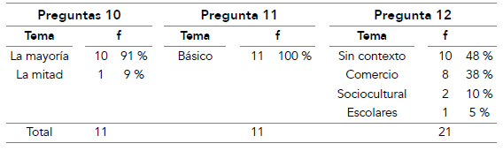La mayoría de los docentes (91%) considera que a sus estudiantes les gusta la clase de matemática (pregunta 10), aunque todos (100%) perciben que los niños han aprendido solo lo básico (pregunta 11). Cuando se les indaga sobre ¿dónde ellos [los niños] pueden utilizar lo que aprenden en las clases de matemática? (pregunta 12), reportan especialmente actividades sin contexto (48%; por ejemplo, en el trabajo). Las actividades que presentan un contexto más claro son las relacionadas al comercio (38%) como, por ejemplo, «En el mercado», «Cuando ayudan a las mamás a vender productos». En dos casos (10%) señalan su uso en la elaboración de artesanías.