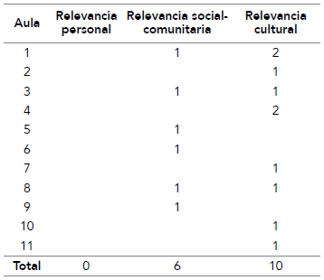 Una vez establecidas las actividades, se identificaron sus posibles vínculos con las dimensiones personal, social-comunitaria y cultural de relevancia. Como se observa en la tabla 13, no se identificaron relaciones entre las estrategias de aula y la relevancia personal. Si bien los profesores utilizan juegos como estrategia de motivación para sus estudiantes, estos juegos no coinciden con aquellos que los niños encuentran interesantes. Tampoco se observan relaciones explícitas entre los contenidos y los sueños futuros de los estudiantes.