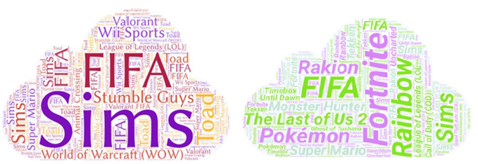Continuando con el análisis de los títulos de los videojuegos, por un lado observamos coincidencias respecto a algunos títulos como Sims y Fifa; por otro lado, existen también diferencias con base en el género (figura 2).