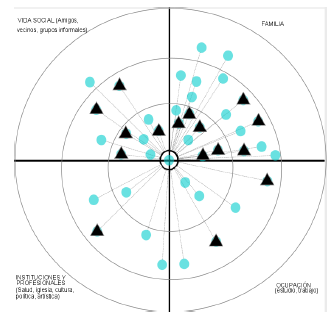 Para iniciar la aplicación de la técnica del mapeo de redes se explicó a cada participante el propósito del ejercicio (el cual buscaba comprender las relaciones sociales en los ámbitos familiares, comunitarios, educativos e institucionales) presentando el mapa de relaciones en formato impreso. Las instrucciones se daban precisando las dimensiones, entornos o cuadrantes que se encontraban en la figura del mapa: familia, ocupación, instituciones y vida social/comunitaria. Además, se indicó que, para registrar la relación percibida con cada persona graficada, se establece un rango de cercanía de va del 1 al 3, siendo 1 poca cercanía, 2 moderada cercanía y 3 mucha cercanía. Estos niveles de cercanía se encuentran señalados a partir de los círculos del mapa, en dónde el centro corresponde a cada adolescente participante. Es importante, indicar que las mujeres se grafican con círculos y los hombres con triángulos (figura 1).