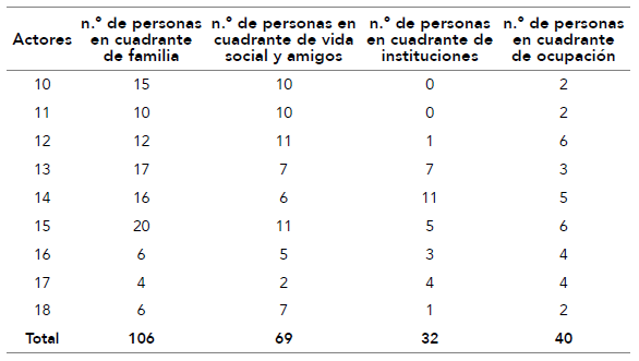 En cuanto a la característica tamaño, la familia constituye el mayor número de contactos que los adolescentes identifican en sus mapeos. Así, considerando la influencia de padres, madres, abuelos y hermanos, las relaciones familiares abarcan gran parte del entorno social de los adolescentes (tabla 1).