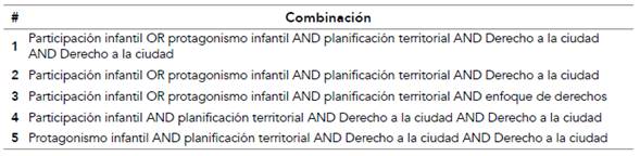 A partir del método facetar, derivar y combinar (Codina, 2020), se utilizan para la búsqueda las palabras clave: participación infantil, protagonismo infantil, planificación territorial, derecho a la ciudad y enfoque de derechos. Para realizar las combinaciones respectivas se utilizan operadores booleanos (tabla 1).