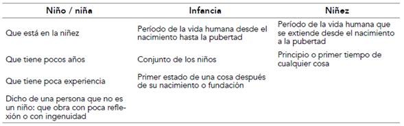 Nota. El cuadro da cuenta de los distintos significados de cada uno de los conceptos que se utilizan en el lenguaje común para referirse a la niñez (Real Academia Española, 2023).