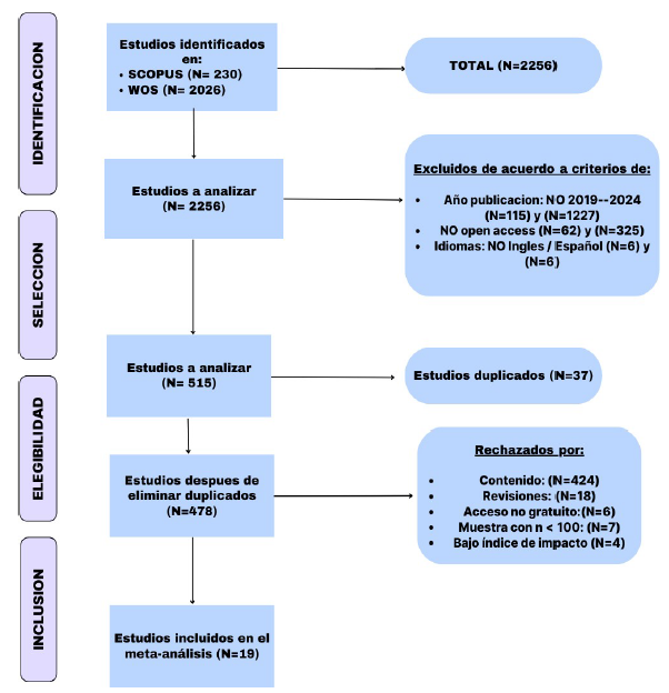 Esta investigación se presenta siguiendo el estándar Prisma (Page et al., 2021; figura 1). Primeramente, en la fase de identificación, se realizó una búsqueda específica sobre los riesgos del abuso de tecnologías asociados a la población adolescente en los buscadores Scopus y Web of Science. Se emplearon las palabras clave «risks» (riesgos), «teenagers» (adolescentes) y «technologies» (tecnologías) en ambas plataformas, con el objetivo de encontrar artículos y estudios que abordaran los riesgos y consecuencias del uso de tecnologías en jóvenes. La muestra inicial se compuso de un total de 2256 estudios, de los cuales 230 fueron encontrados en Scopus y 2026 en Web of Science. Posteriormente, en la etapa de selección de los artículos se llevó a cabo un proceso de filtrado atendiendo a los siguientes criterios específicos: se seleccionaron solo aquellos publicados entre 2019 y 2024, excluyendo los que no cumplían con estas fechas (115 de Scopus y 1227 de Web of Science).