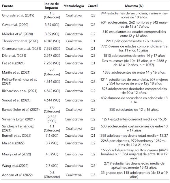 A continuación, se incluyen tablas realizadas a partir de la revisión de los mencionados artículos. En primer lugar, la tabla 1 presenta el índice de impacto de las revistas en las que fueron publicados —diferenciando si el mismo pertenece al Science Citation Index (en adelante, SCI), Social Sciences Citation Index (en adelante, SSCI) o Citescore, indicadores de Web of Science y Elsevier para garantizar la credibilidad de la publicación—, junto al cuartil, la metodología y una breve descripción de la muestra de cada estudio. Se han ordenado las fuentes atendiendo a su año de publicación. En este sentido, cabe destacar que en la revisión realizada no se encontraron artículos publicados en 2023 o 2024.