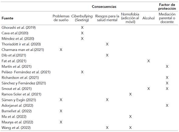 El análisis de los resultados obtenidos ofreció la posibilidad de categorizar los tipos de consecuencias que se derivan del uso de las tecnologías por parte de la población adolescente. Los diferentes autores seleccionados se centran en cinco grandes secuelas que se producen: problemas de sueño, conflictos entre iguales (especialmente ciberbullying, e incluyendo en esta categoría el sexting, o compartir contenido de índole sexual), riesgos para la salud mental, nomofobia (también conocida como adicción al móvil) y consumo de alcohol.
